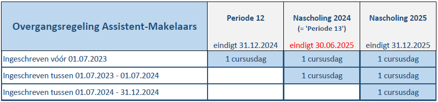Er is een overgangsregeling vastgesteld om de diverse ‘periodes’ gelijk te stellen aan kalenderjaren, wat voor iedere Assistent-Makelaar meer duidelijkheid schept. Dit kan betekenen dat de nascholingsverplichting eenmalig afwijkt van wat u gewend was.
