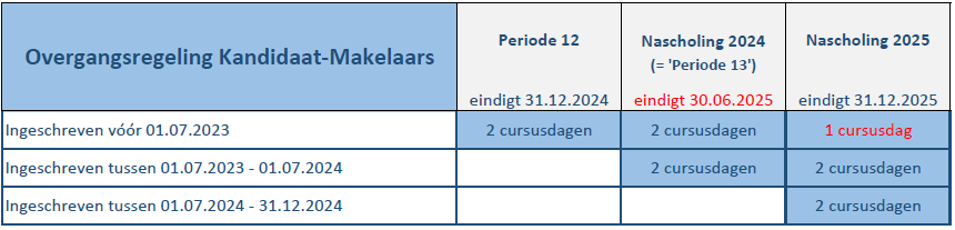 Er is een overgangsregeling vastgesteld om de diverse ‘periodes’ gelijk te stellen aan kalenderjaren, wat voor iedere Kandidaat-Makelaar meer duidelijkheid schept. Dit kan betekenen dat de nascholingsverplichting eenmalig afwijkt van wat u gewend was.